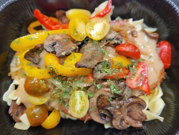 Smothered Pork Chops with Peppers, Mushrooms, Onions, and Tomatoes in a Cream Gravy over Egg Noodles